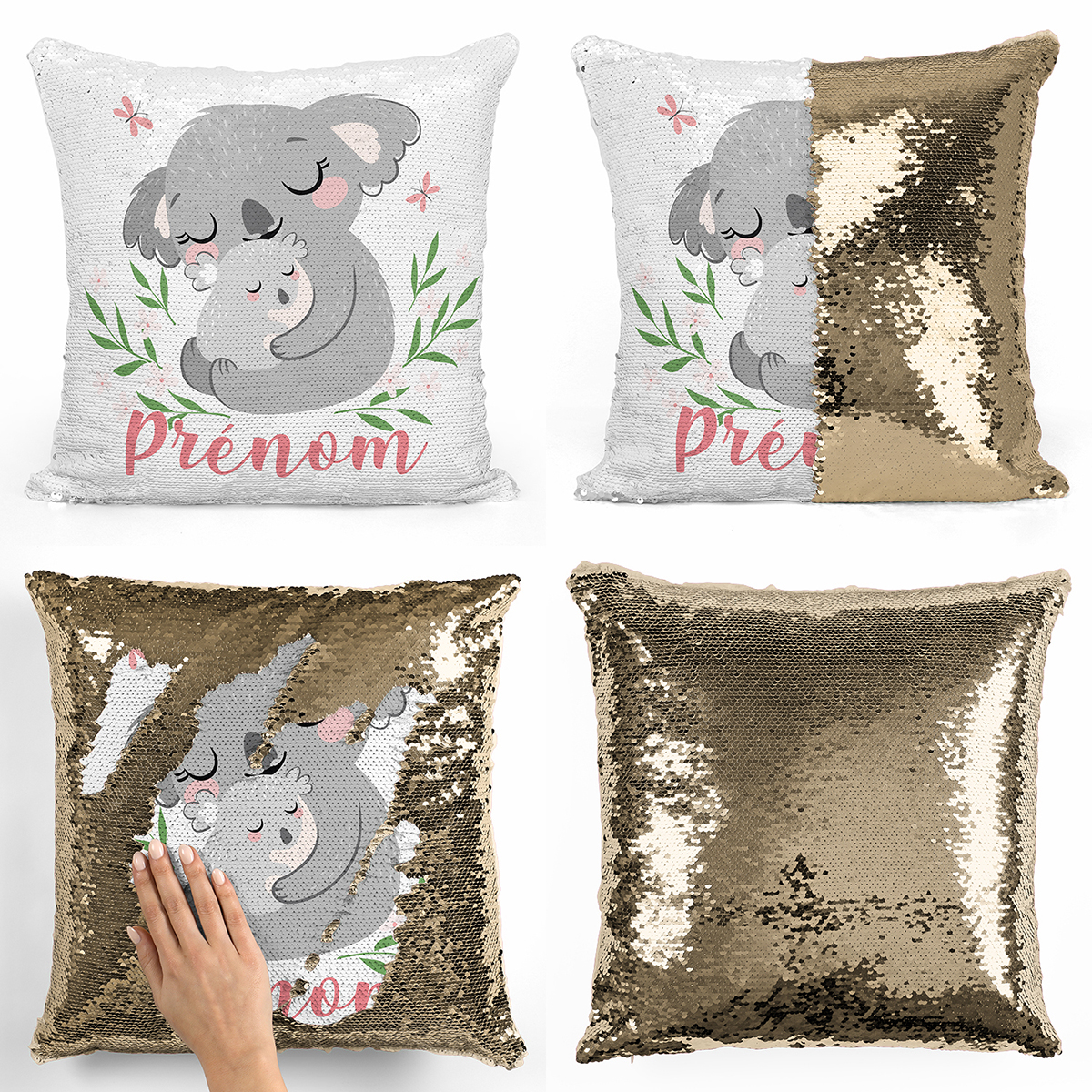 Create in 2 seconds your Magic sequin glitter pillow with Koalas pattern by personalising it with the first name of your child !